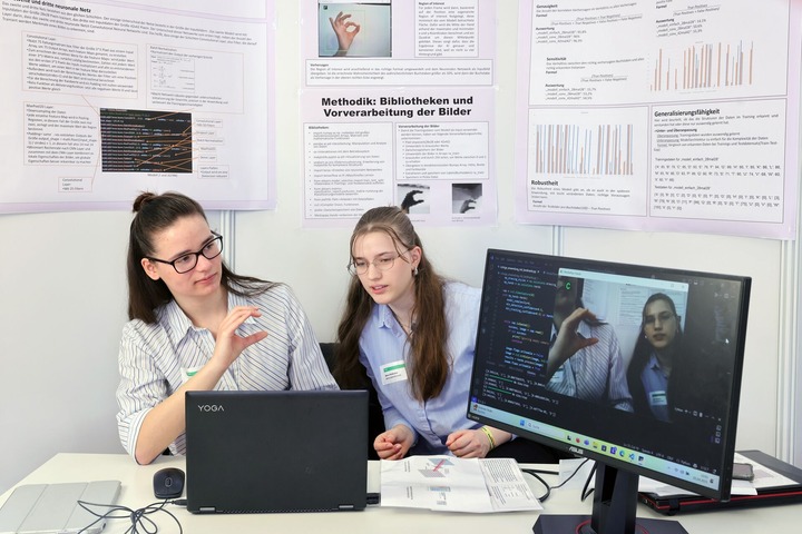 Unter dem Motto „Macht aus Fragen Antworten" stellten die jungen Teilnehmer Lösungen für Probleme und Fragen der Wissenschaft beziehungsweise der heutigen Zeit vor. Milena Reißmann und Lisa Matthäus vom Paulus-Praetorius-Gymnasium haben einen Digitalen Dolmetscher entwickelt. Die 16-jährigen Nachwuchsforscherinnen wurden für ihre KI und Gebärdensprache mit dem ersten Preis im Fachgebiet Mathematik/Informatik im Landeswettbewerb Jugend forscht Brandenburg ausgezeichnet. Damit haben sie die Eintrittskarte für das Bundesfinale gewonnen. In Hamburg können sie ihr Projekt dann im Rahmen des 60. Bundeswettbewerbs vom 29. Mai bis zum 1. Juni vorstellen. Einen zweiten Platz erreichte der 18-Jährige Shahin Sultan vom Paulus-Praetorius-Gymnasium für sein Projekt „Straßenwind eingefangen! Die Untersuchung deiner vertikalen Windturbine". Über einen Sonderpreis Ressourceneffizienz darf sich Oliver Zinsen für sein Projekt „Showers for Future" vom Barnim Gymnasium freuen.