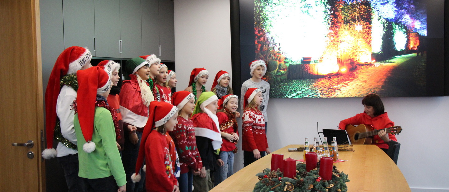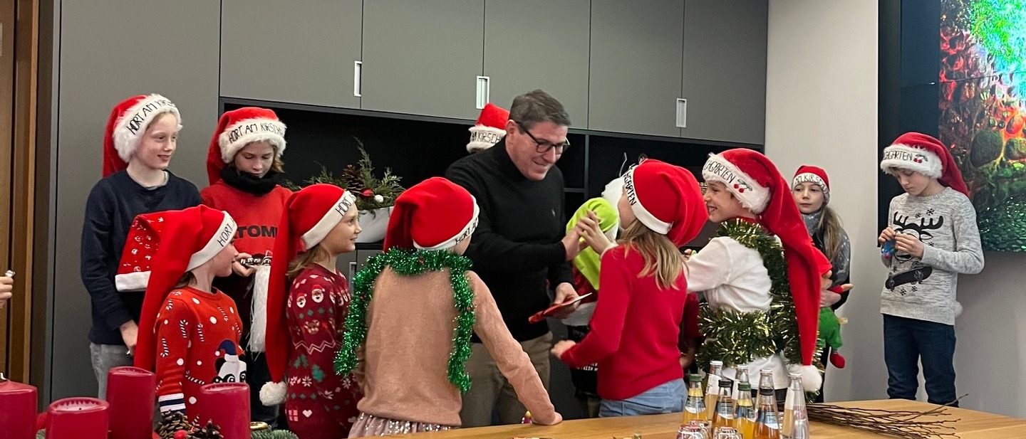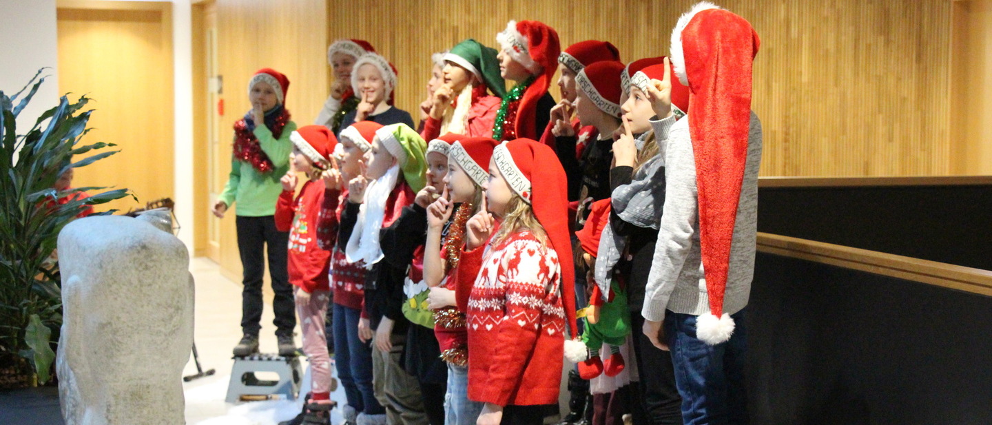 „He, Frau Holle" hallte es bei weihnachtlicher Außentemperatur durch das Neue Rathaus Bernau. Am Donnerstag, dem 12. Dezember, war der Chor des Hortes am Kirschgarten im Rathaus zu Gast und überraschte den Bürgermeister sowie die Mitarbeiterinnen und Mitarbeiter mit einem weihnachtlichen Mini-Konzert.