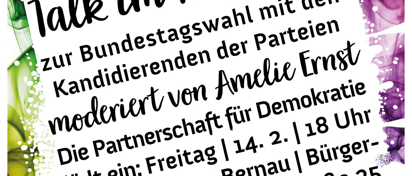 In gut einer Woche wird ein neuer Bundestag gewählt. Um den Bernauerinnen und Bernauern die Wahl, die Themen und die verschiedenen Parteien nahe zu bringen, findet am Freitag, dem 14. Februar 2025, um 18 Uhr, der 'Talk im Rathaus' zur Bundestagswahl im Bürgersaal im Neuen Rathaus Bernau statt.