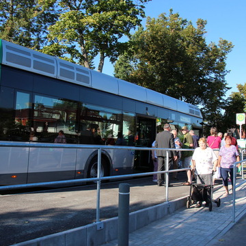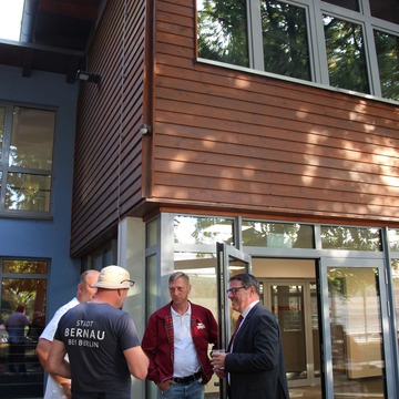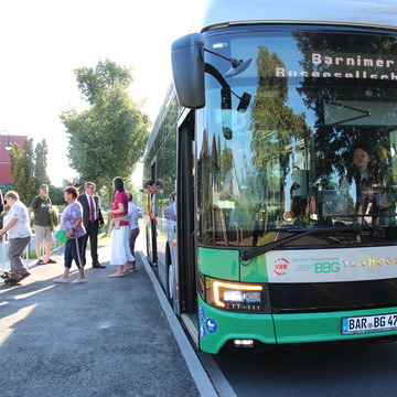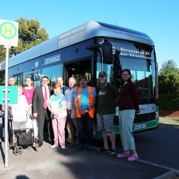 Pünktlich um 9 Uhr hielt am Montag, dem 8. September, ein Bus der Linie 908 an der neuen Station „Venusbogen" an der Börnicker Chaussee 76. Begrüßt wurde er u.a. von Bürgermeister André Stahl, Kai Wulfes von der Barnimer Busgesellschaft (BBG) und von Günter Jorigk.