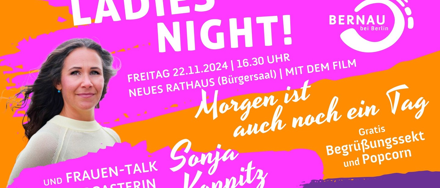 Alle Frauen aus Bernau und Umgebung sollten sich den 22. November im Kalender markieren. Die Stadt Bernau lädt ab 16.30 Uhr zur 3. „Ladies Night" ein. Im Bürgersaal des Neuen Rathauses Bernau wird der Film „Morgen ist auch noch ein Tag" gezeigt und mit Podcasterin Sonja Koppitz zum Thema Gewalt gegen Frauen diskutiert.