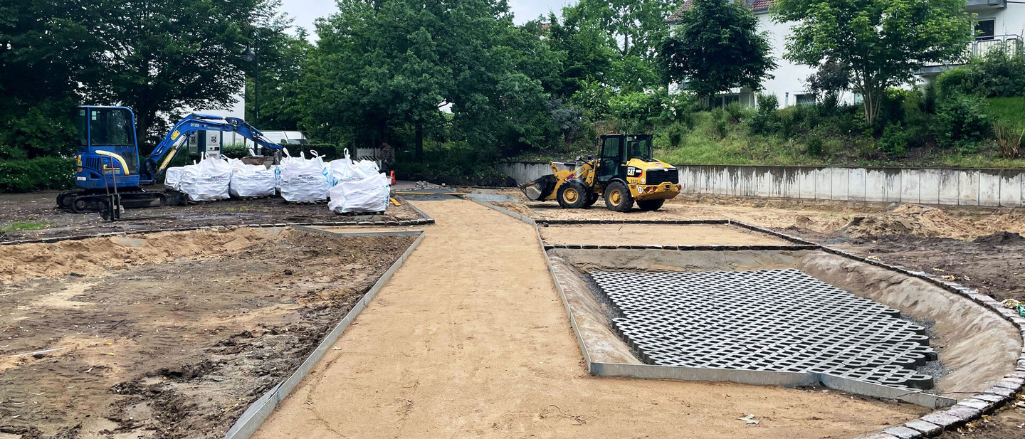 Seit einem Monat rollen zwischen Schlehenstraße und Hopfenweg die Bagger, werden Steine geklopft und Materialien verlegt. Die Arbeiten am Neubau des Spielplatzes im Kirschgarten haben begonnen und zum Ende des Sommers sollen die Kinder den neuen Platz in Besitz nehmen können.